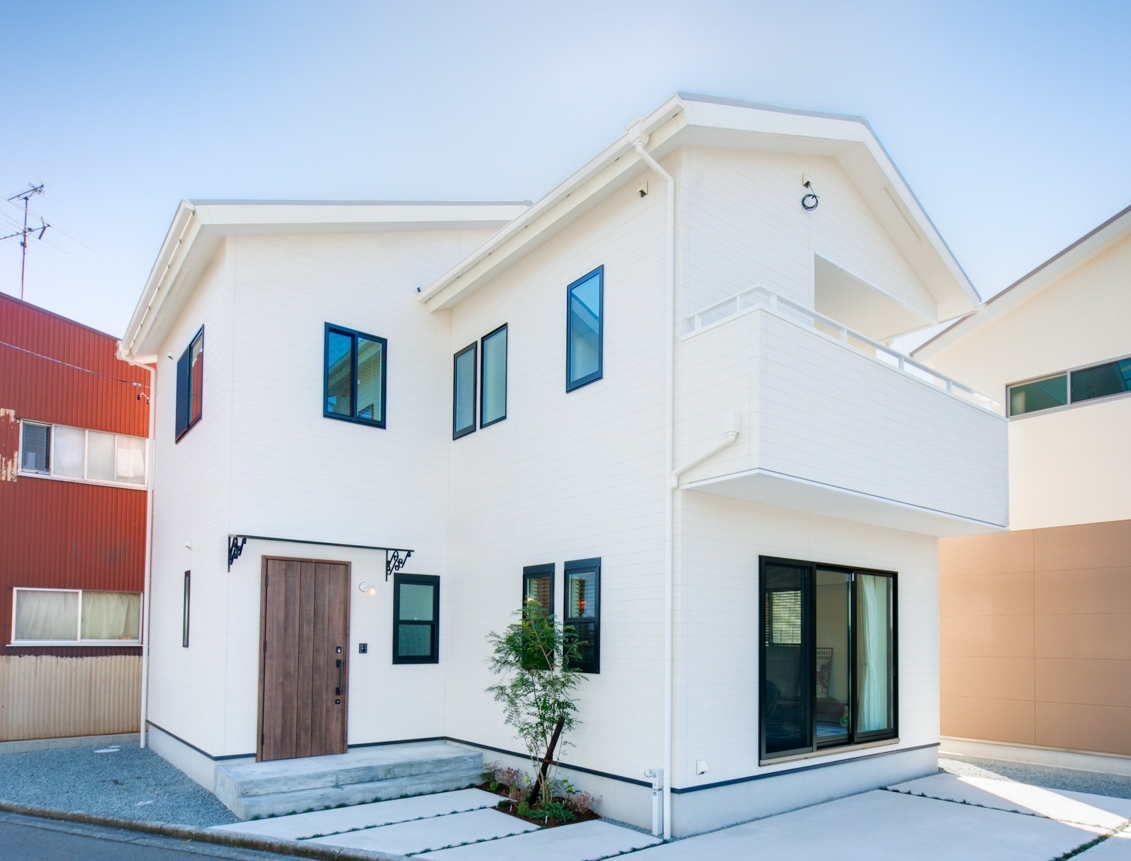 白いサイディングに黒いサッシのシンプルな外観 個性的な内観との