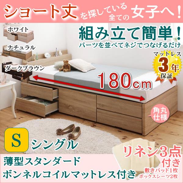 シングルベッド ショート丈 収納付きベッド 薄型スタンダードボンネル