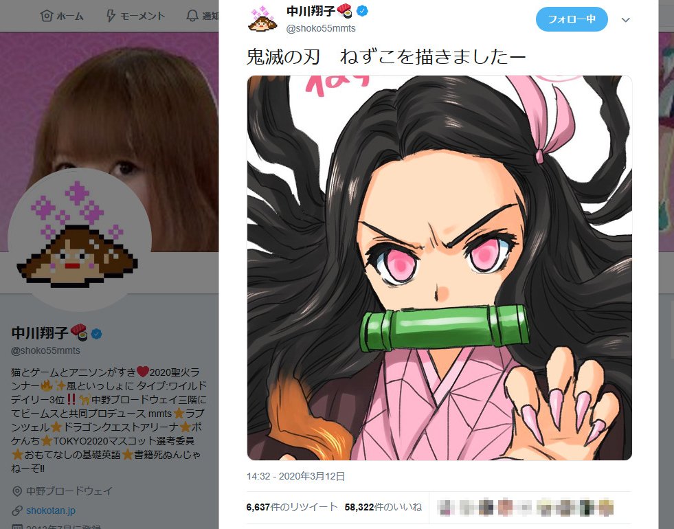中川翔子さん 鬼滅の刃 ねずこを描きましたー 竈門禰豆子のイラストをtwitterに投稿し反響 ニコニコニュース